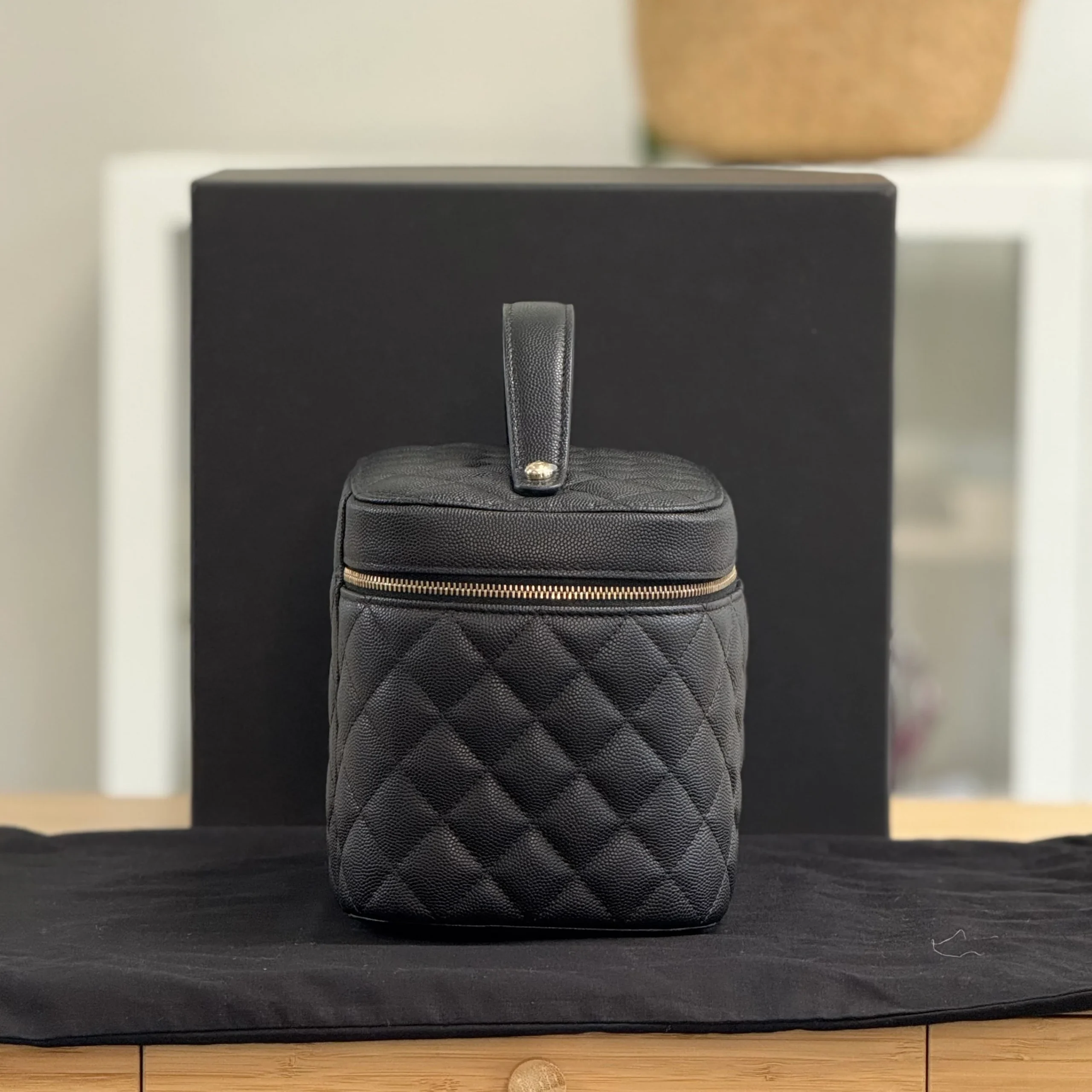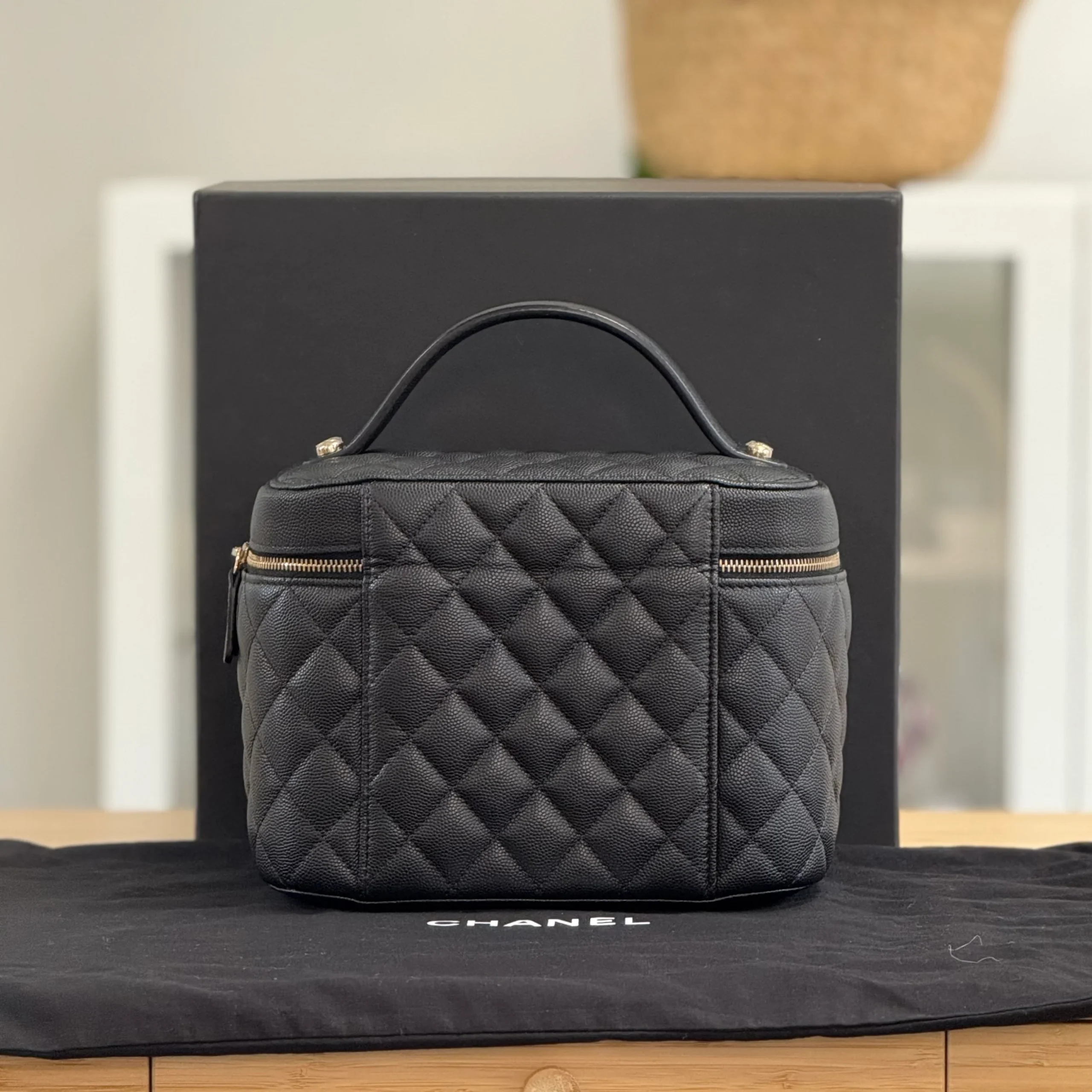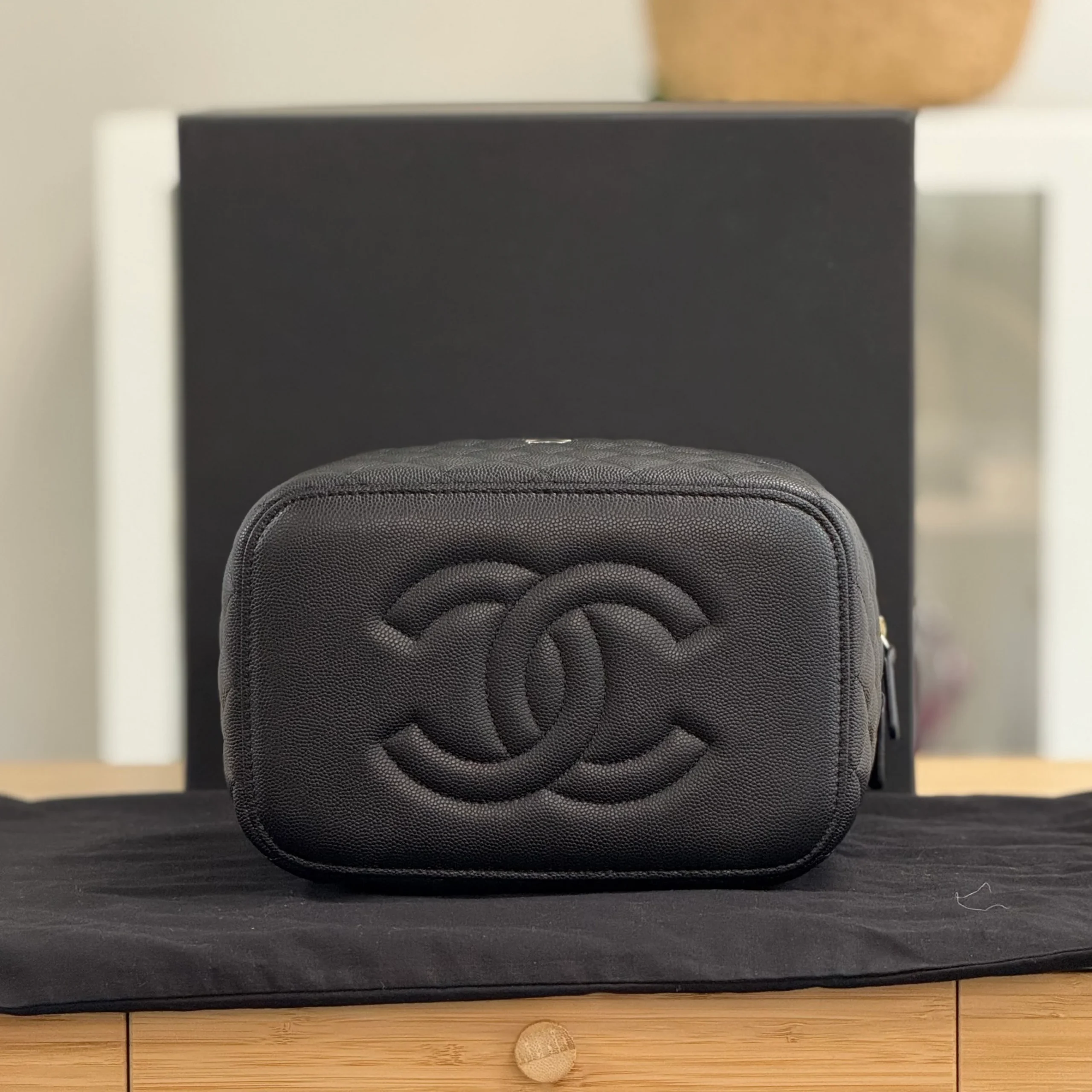 This Chanel Vanity has 1 top handle. It has a lid closure with a zip-around fasten. Inside it has 1 mirror which is attached to the interior by a chain with a press-stud. It has 1 flat pocket and 2 elasticated flat pockets. Verified with Entrupy Authentication.