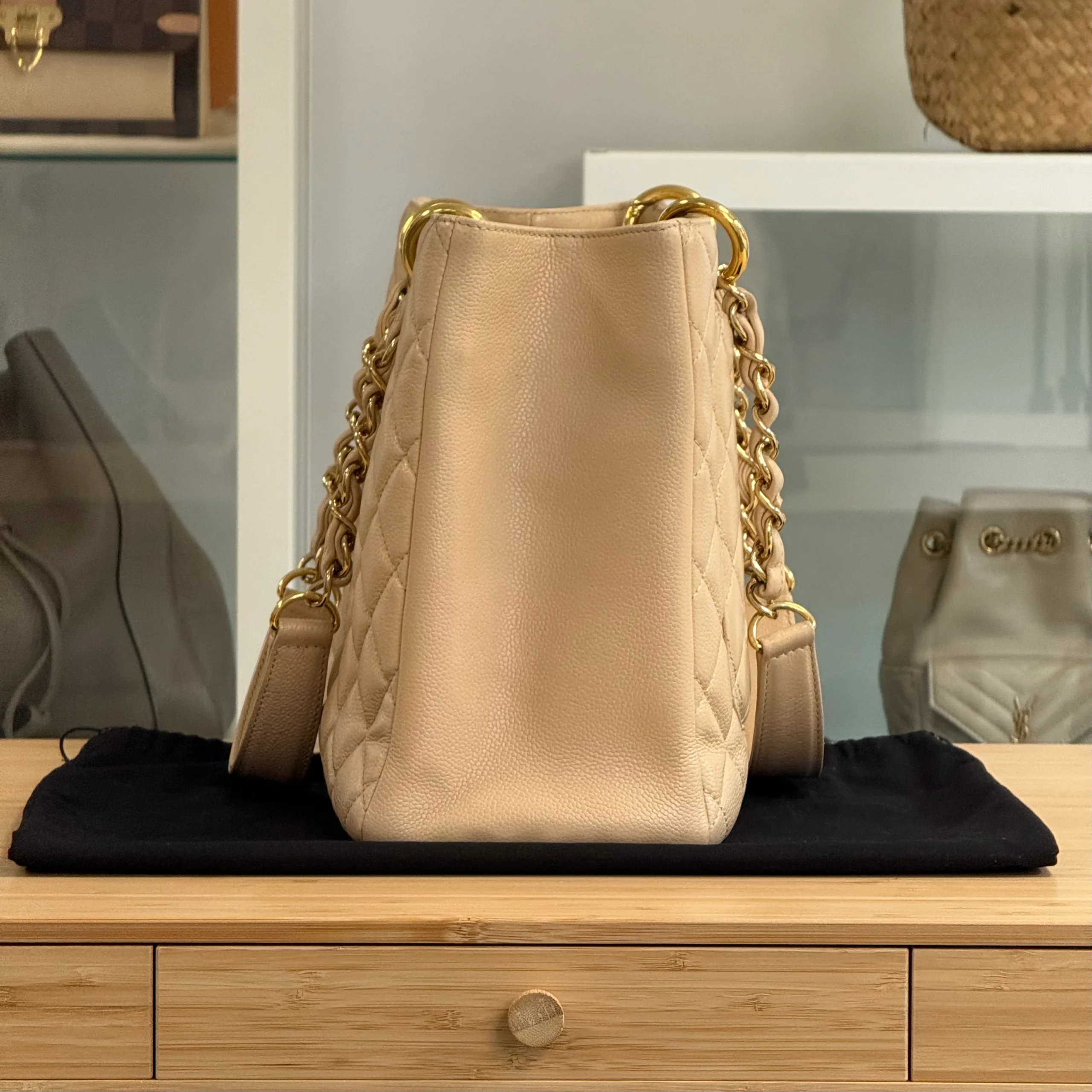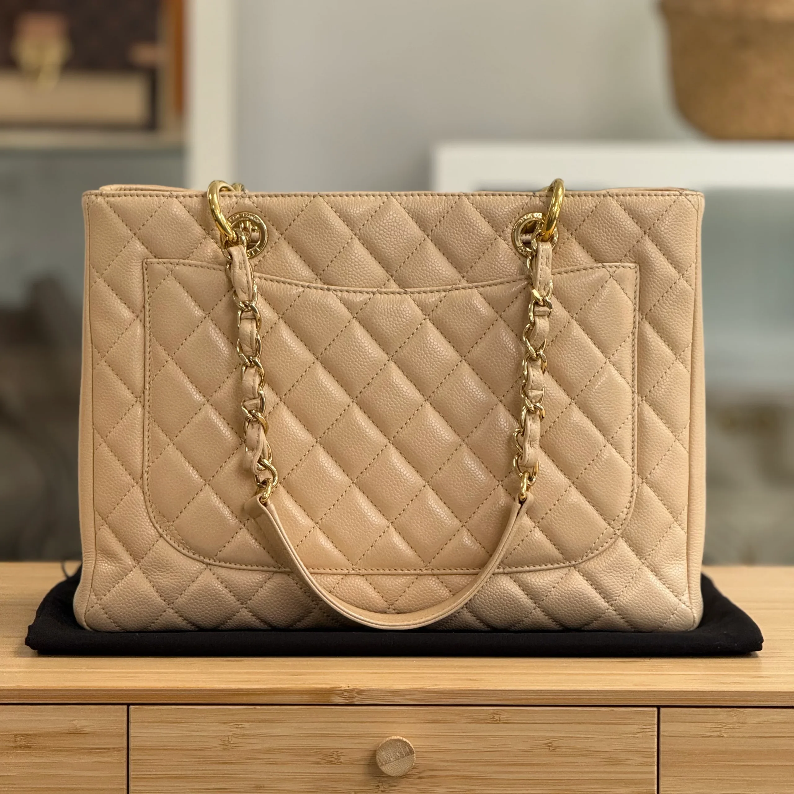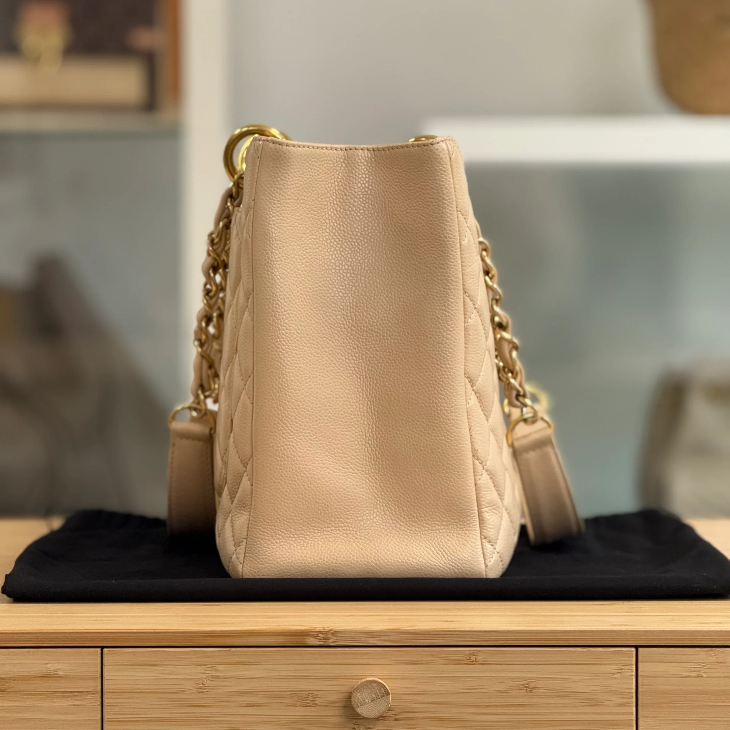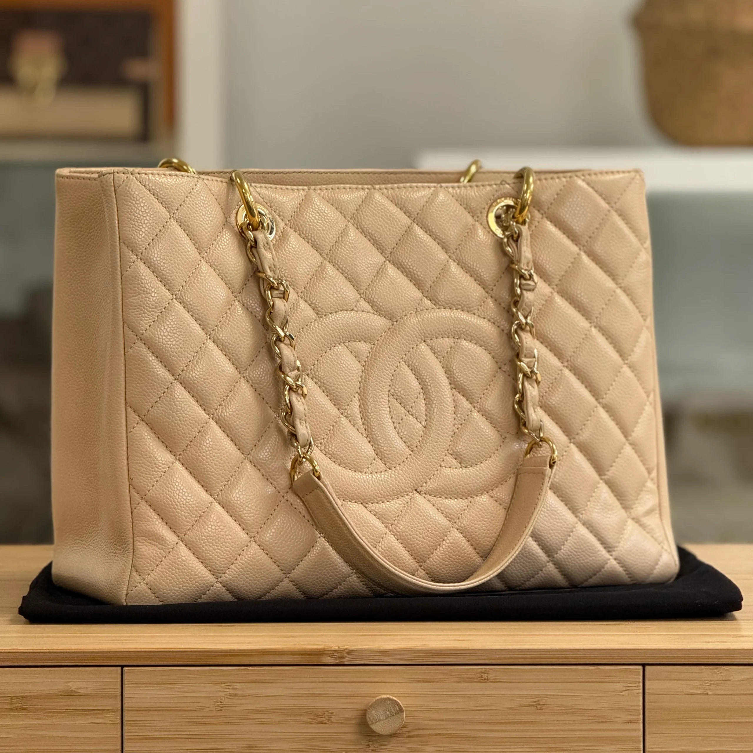 This Chanel GST has double top handles. It has 1 external flat pocket on the back. Inside there are 2 compartments divided by a central zipped pocket. In the back compartment there is 1 zipped pocket, and 1 key-clip. In the front compartment there is 1 flat pocket. This is a 13 series Chanel so it is from 2009-2010. Verified with Entrupy Authentication.