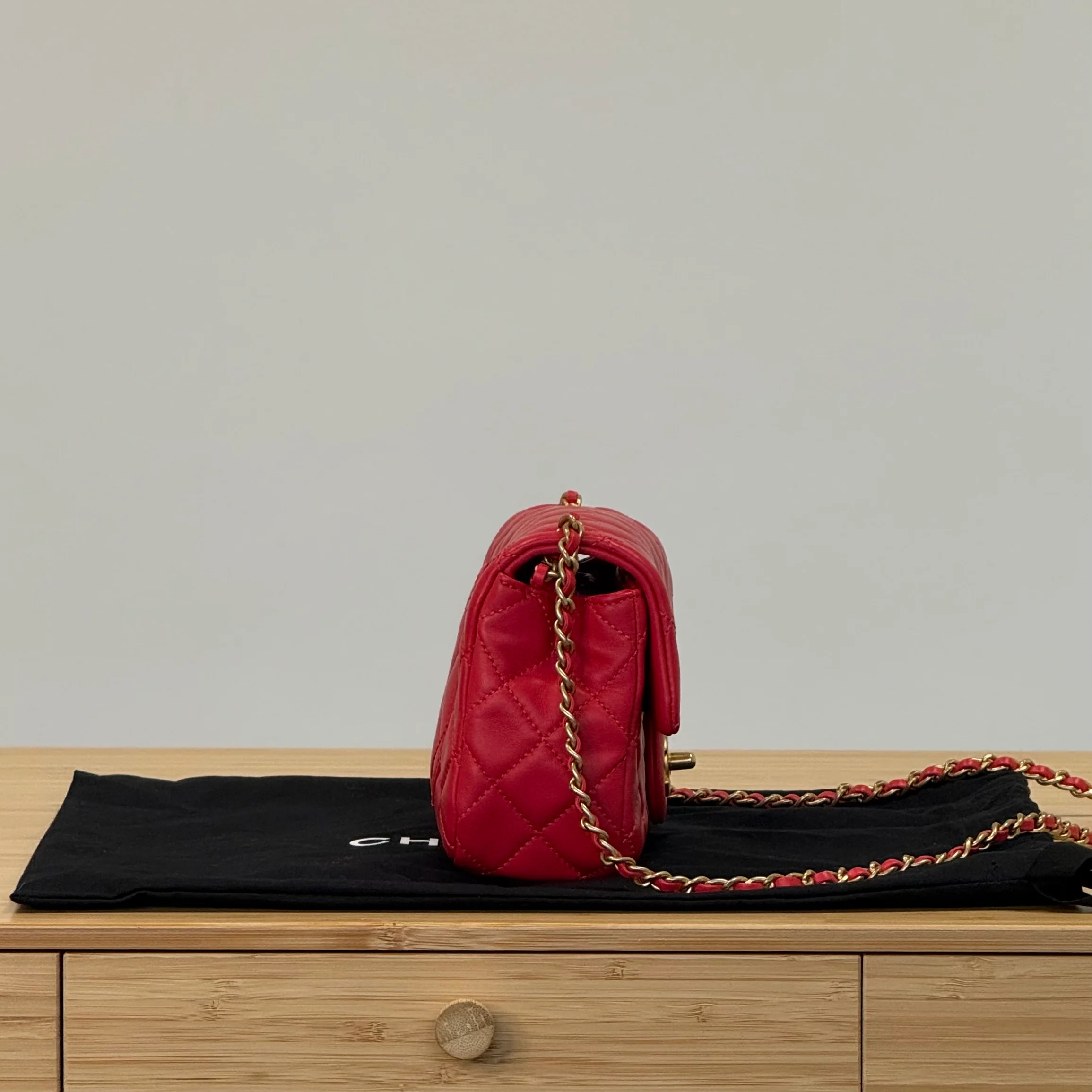 Fabric: Exterior-lambskin. Interior-lambskin. Strap-leather & chain