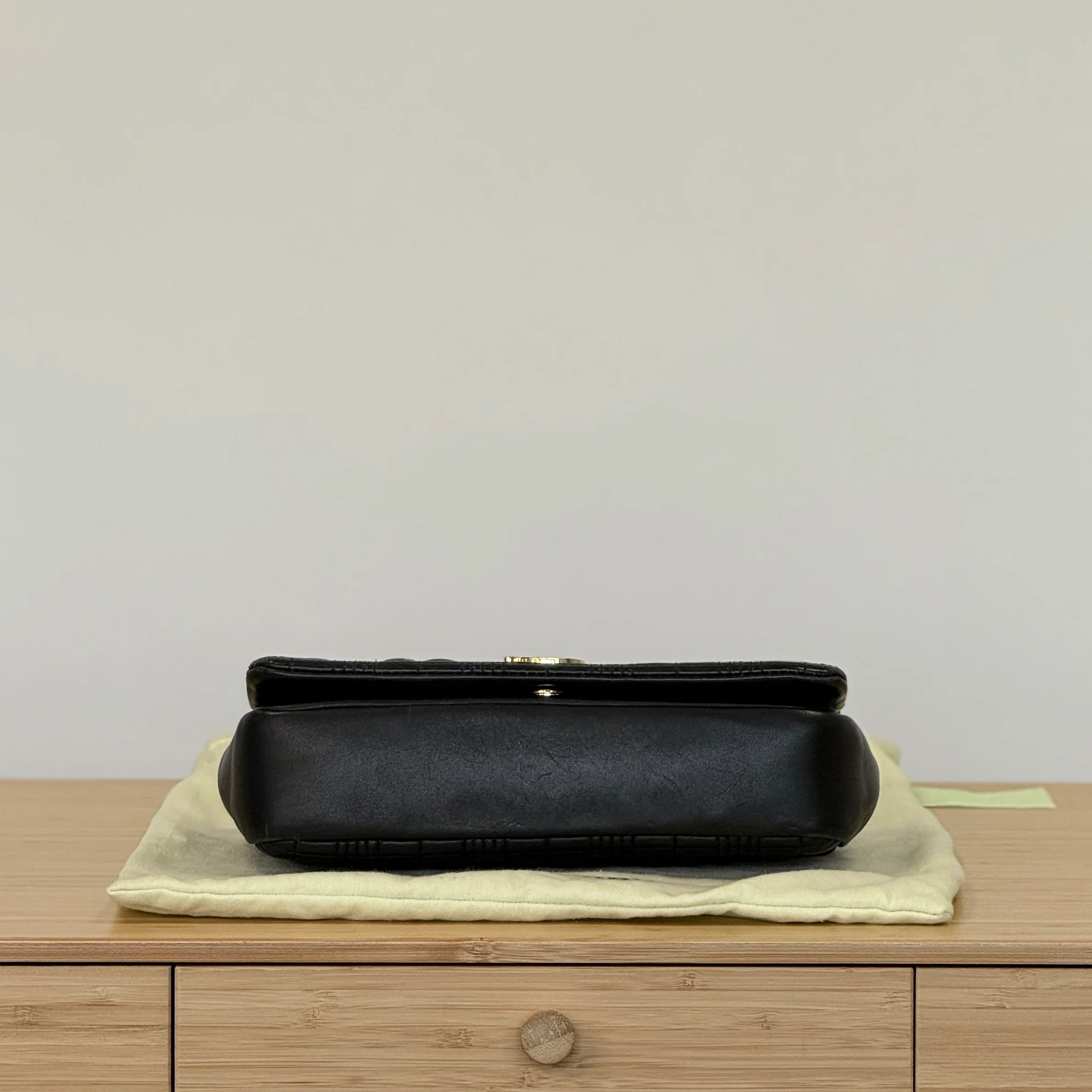 This Burberry Lola in size small has a long adjustable strap, and a flap closure with a press-stud fasten. Inside there is 1 flat pocket.
