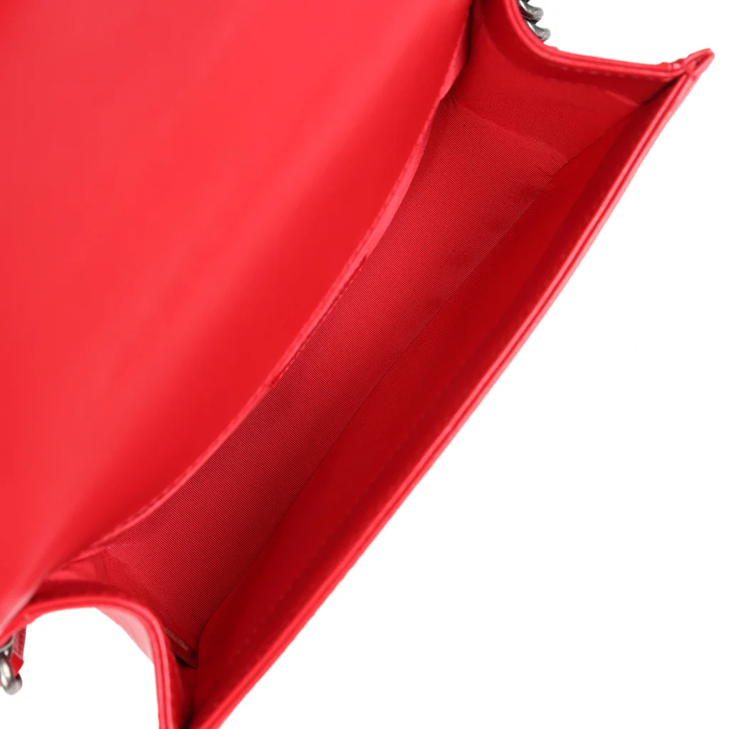 The interior is lined with Black lambskin and has a main open compartment, two small slip pocket on front wall with a removable mirror, and one zip pocket on rear wall.